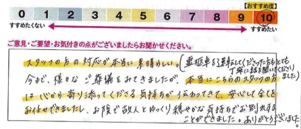 安心してすべてをお任せできましたし、おかげで故人とゆっくり穏やかな気持ちでお別れすることができました。ありがとうございました。