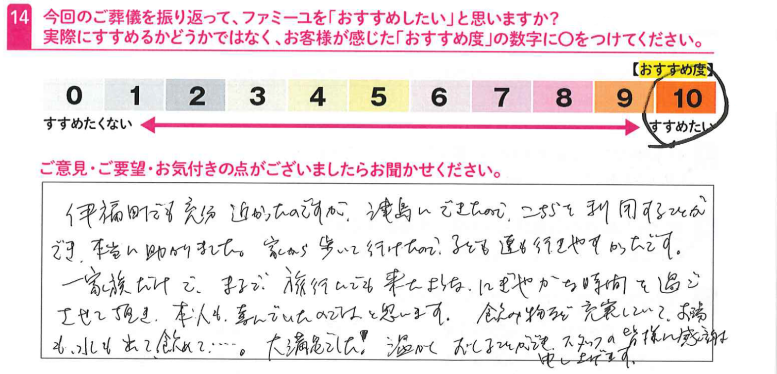 温かくおくることができ、スタッフの皆様に感謝申し上げます。