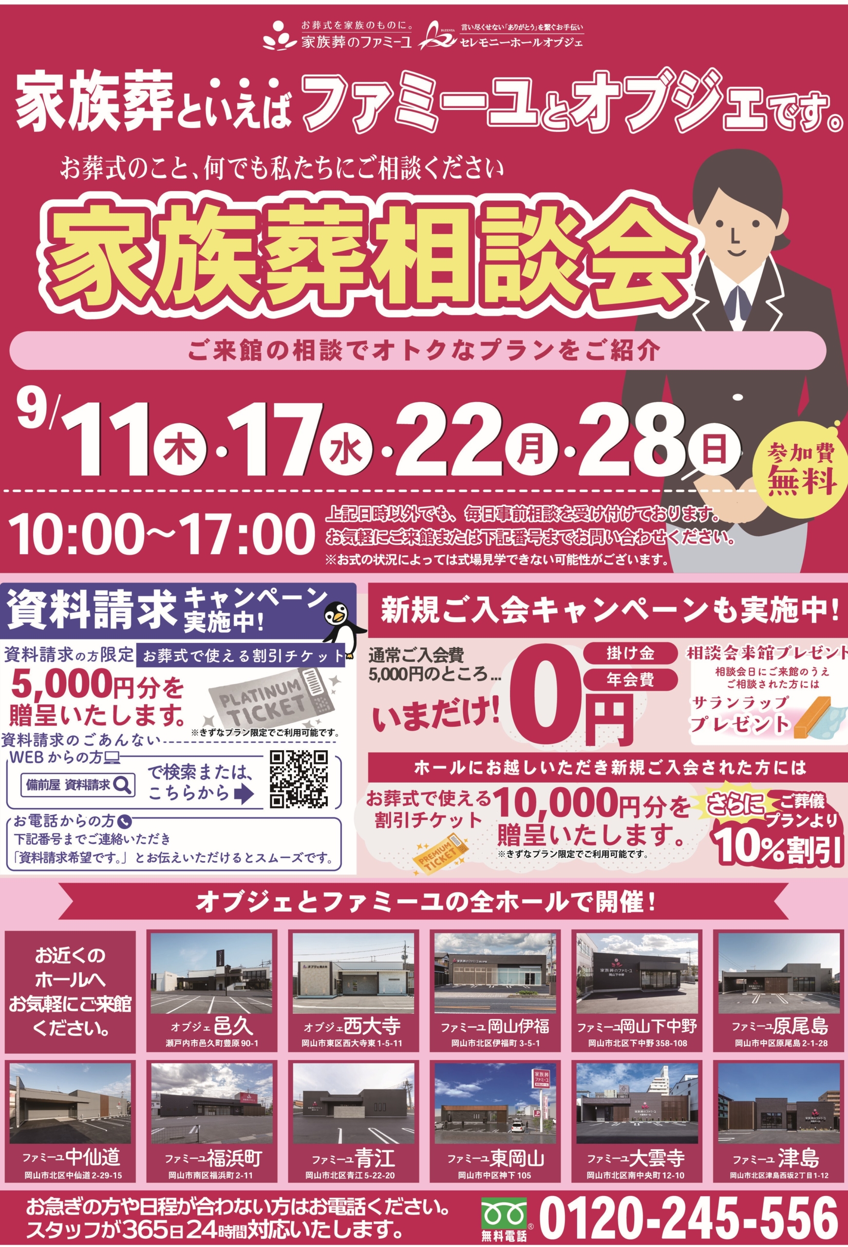 備前屋TOP > 地域から探す > 岡山市 > お知らせ・イベント情報 > 【無料相談会】9月 家族葬相談会開催日のお知らせ! > 2025.9相談会-0